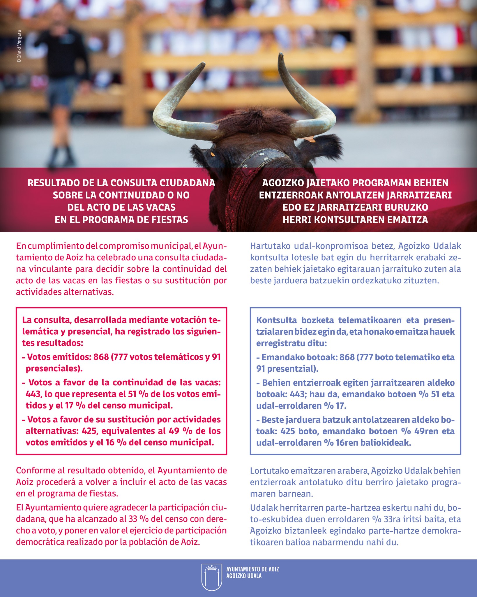 Agoiztarrek bazuten hitzordua bigantxak antolatzearen inguruko herri-galdeketari. Deialdi honi 868 herritarrek erantzun zioten, horiek baitira gerturatu edota telematikoki euren iritzia eman zutenak. Astean zehar aldekoen eta kontrakoen kanpainak ere nabariak izan dira, betiere errespetuz eta azkenean 18 bozkaren aldea izan da bi aukeren artean. Bigantxak antolatzearen alde %51k egin du %49ak kontra. Orain udalari dagokio […]