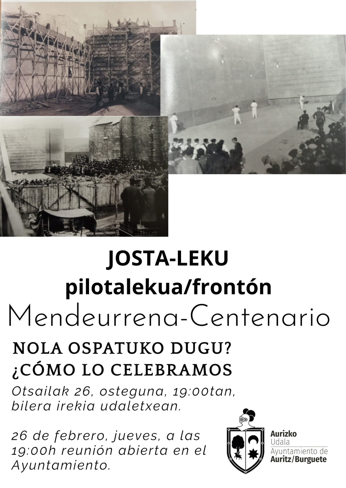 Auritz herriko ardatz eta ehundaka pilotarien akuilu izandako Josta-leku frontoiak 100 urte beteko ditu aurten. Hasieran zeru zabalekoa zen, gerora XX. mende erdialdean estali egin zuten. Pala txapelketak, esku pilota, … Auritzeko nortasuna eraikitzen lagundu duen eraikina dugu Josta-leku. Kirola nabarmendu den arren, beste ospakizun zenbaiten gordeleku izan da frontoia. Mendeurrena behar bezala ospatzeko deia […]